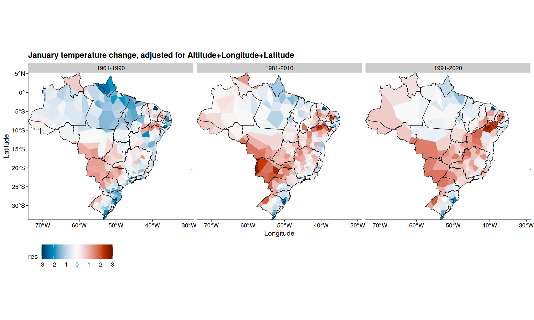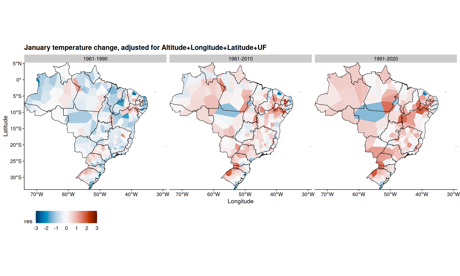 labs(title='January temperature change, adjusted for Altitude+Longitude+Latitude+UF') +