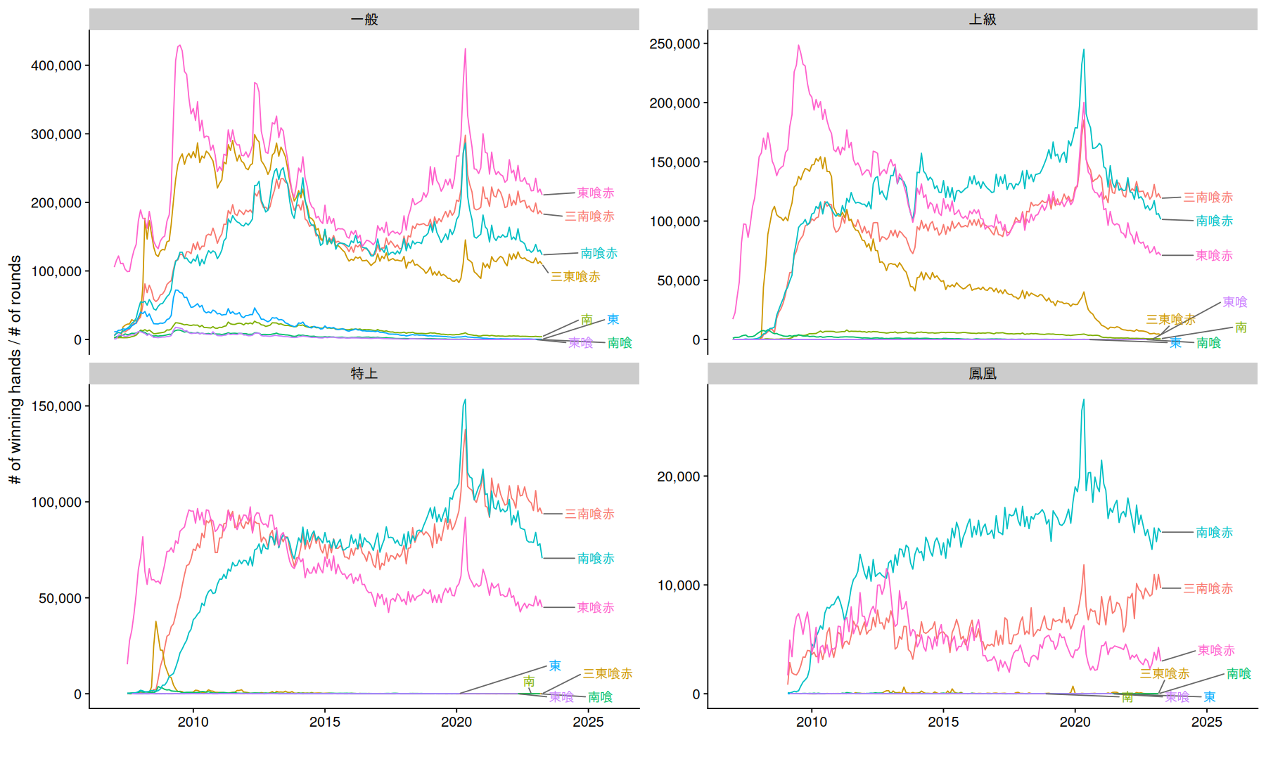 the data is aggregated by month, room rank and game type, totalling 1.4 billion winning hands