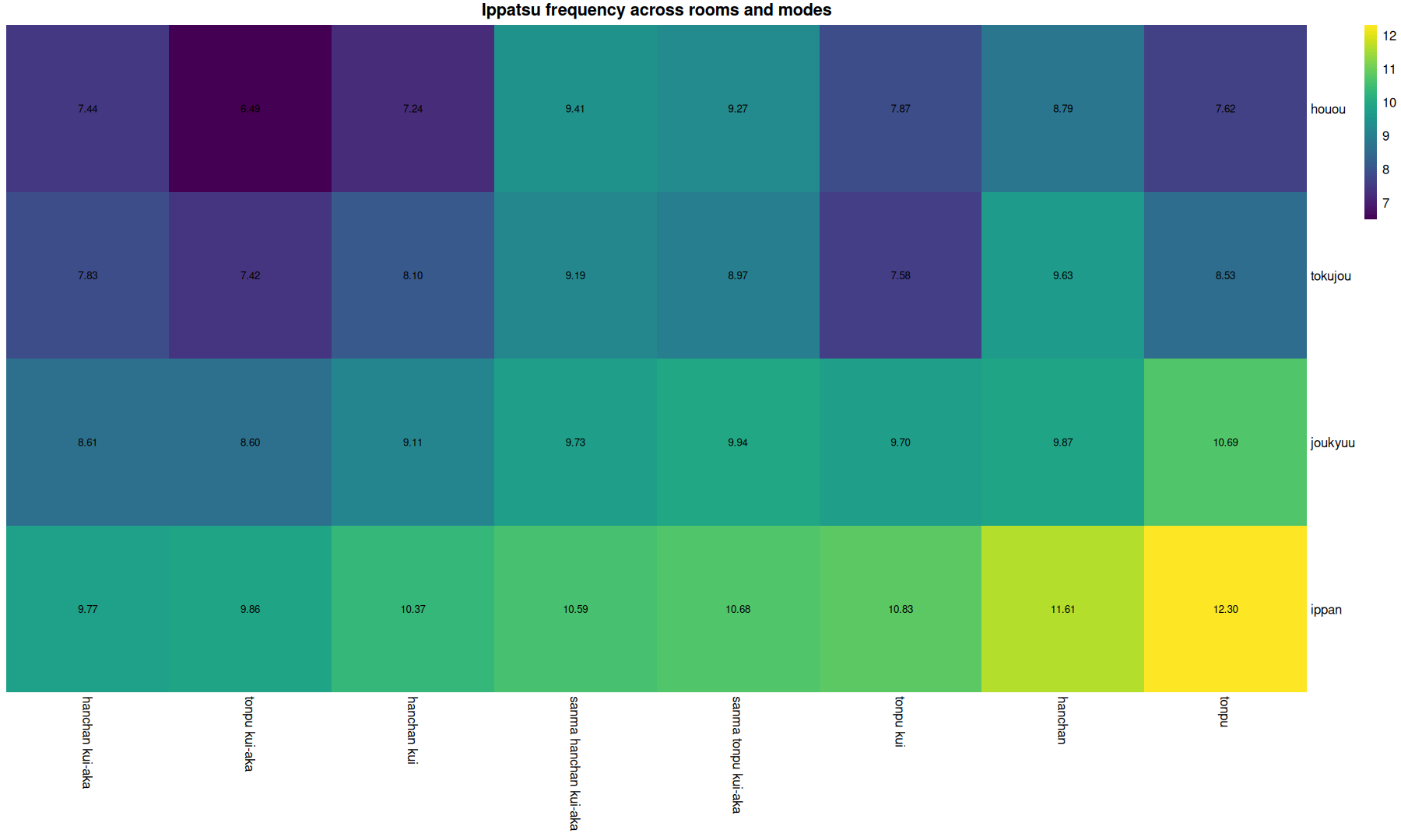 pheatmap(display_numbers = TRUE,main='Ippatsu frequency across rooms and modes', color=viridis(100), number_color = 'black', cluster_rows=F, cluster_cols=F, border_color = NA)