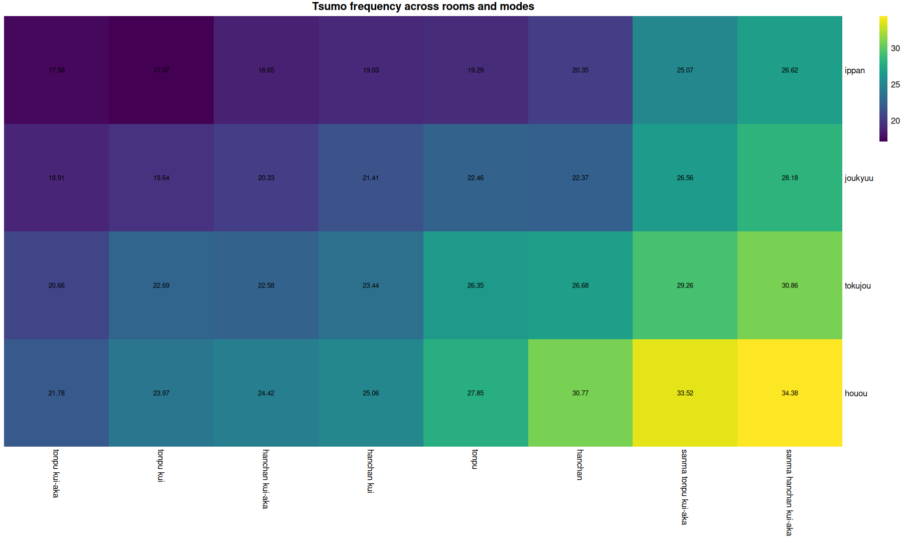 pheatmap(display_numbers = TRUE,main='Tsumo frequency across rooms and modes', color=viridis(100), number_color = 'black', cluster_rows=F, cluster_cols=FALSE, border_color = NA)