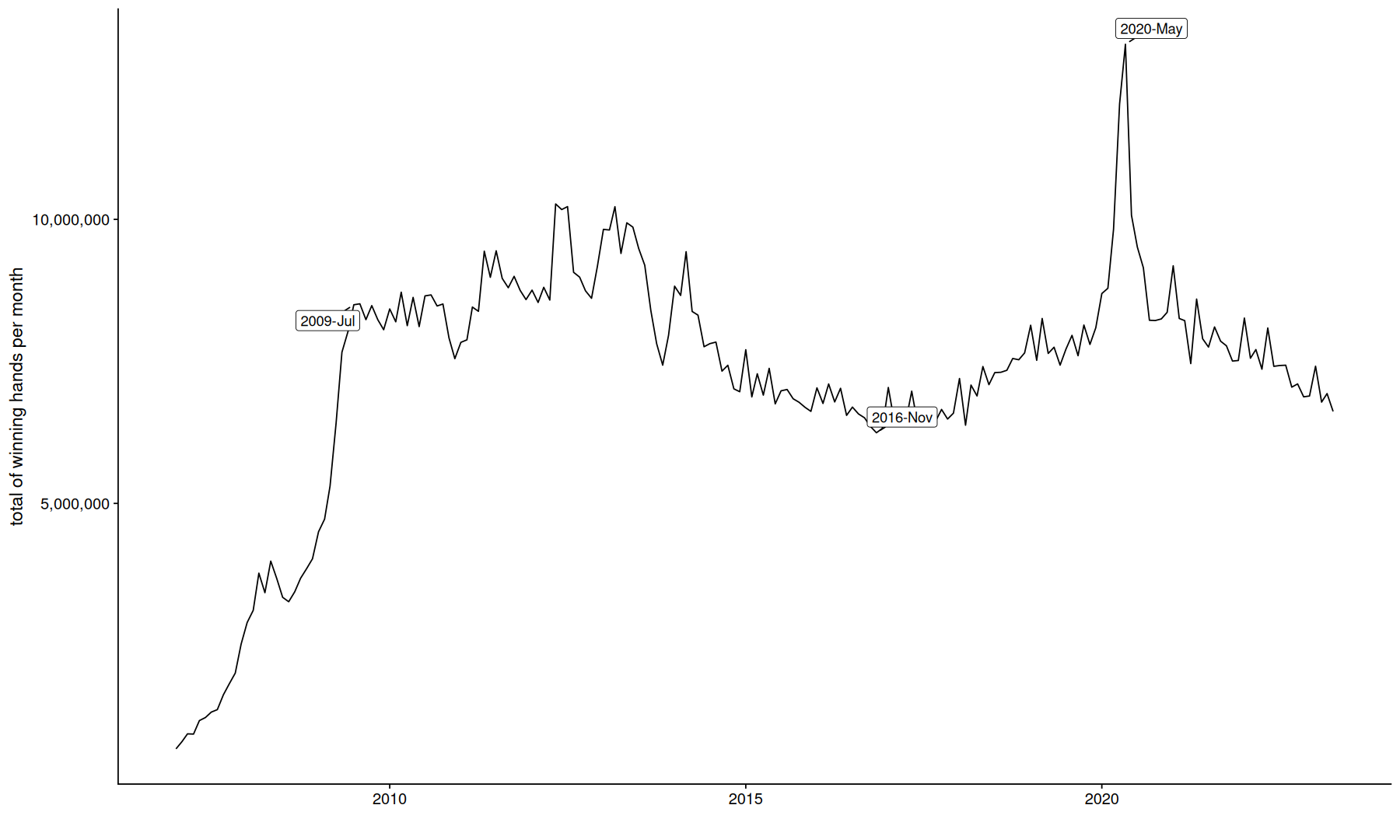 may-2020 had the highest number of winning hands, and is probably because a state of emergency was declared in Japan at the time due to covid-19