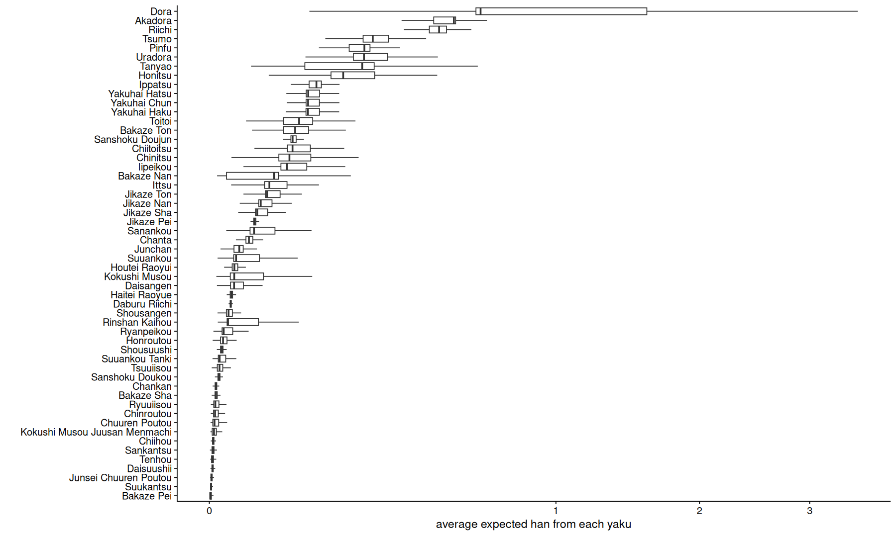 ggplot(aes(x=avg_exp_han, y=fct_reorder(yaku_romaji,avg_exp_han, .na_rm=TRUE))) + geom_boxplot(outlier.shape = NA) +