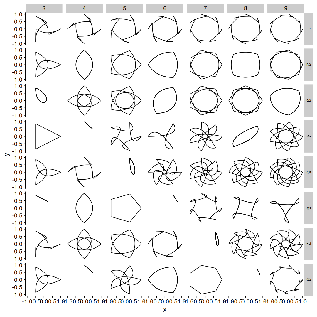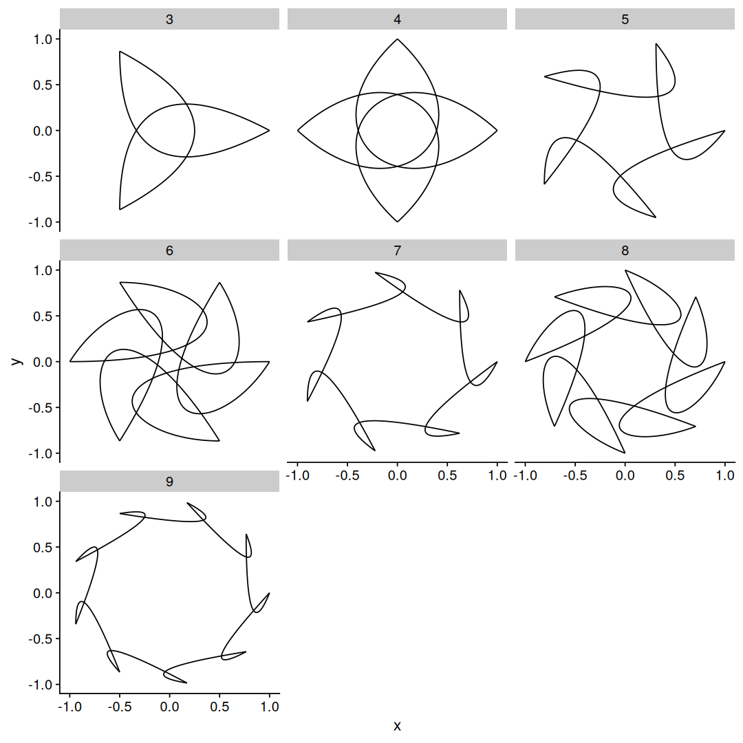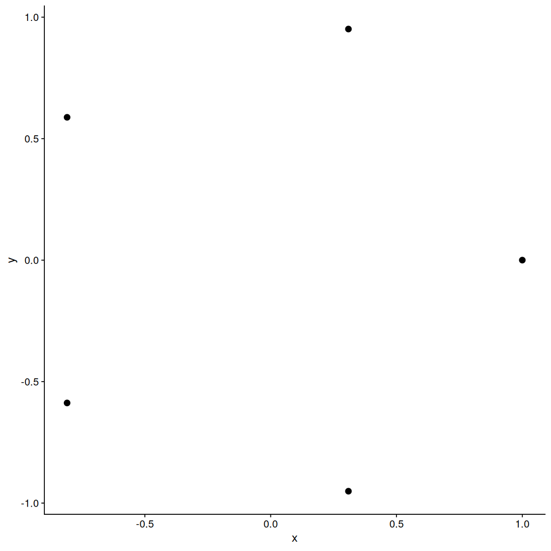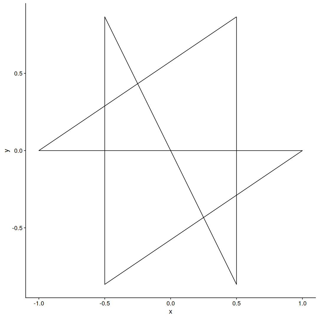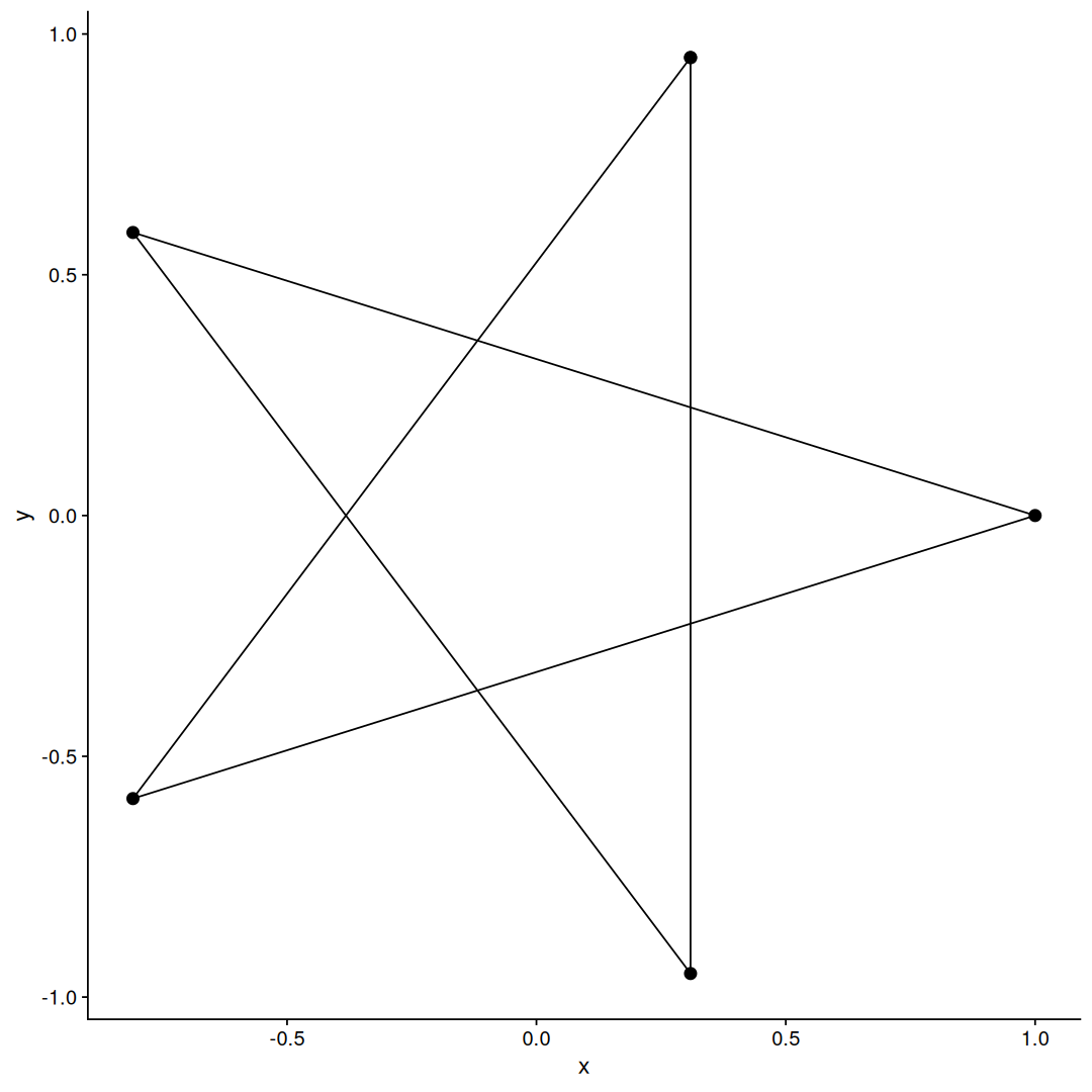 If you look back at the pentagram example above, you will see that the points don’t connect to their adjacent point, instead they “skip” a point and connect to the next one, the dplyr package has a function called slice that allows us to take rows from a data frame by their index, using this function we can reorder our points with a vector of indexes: