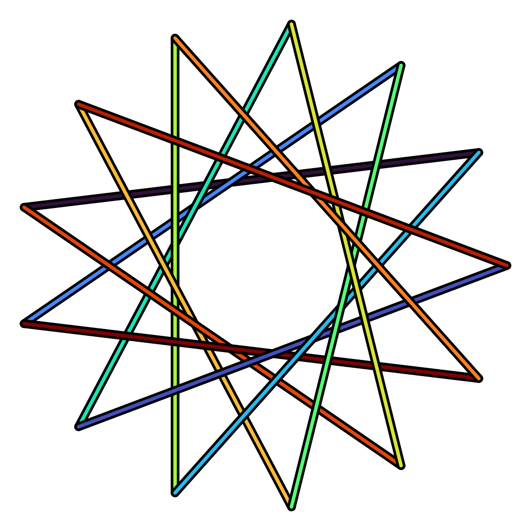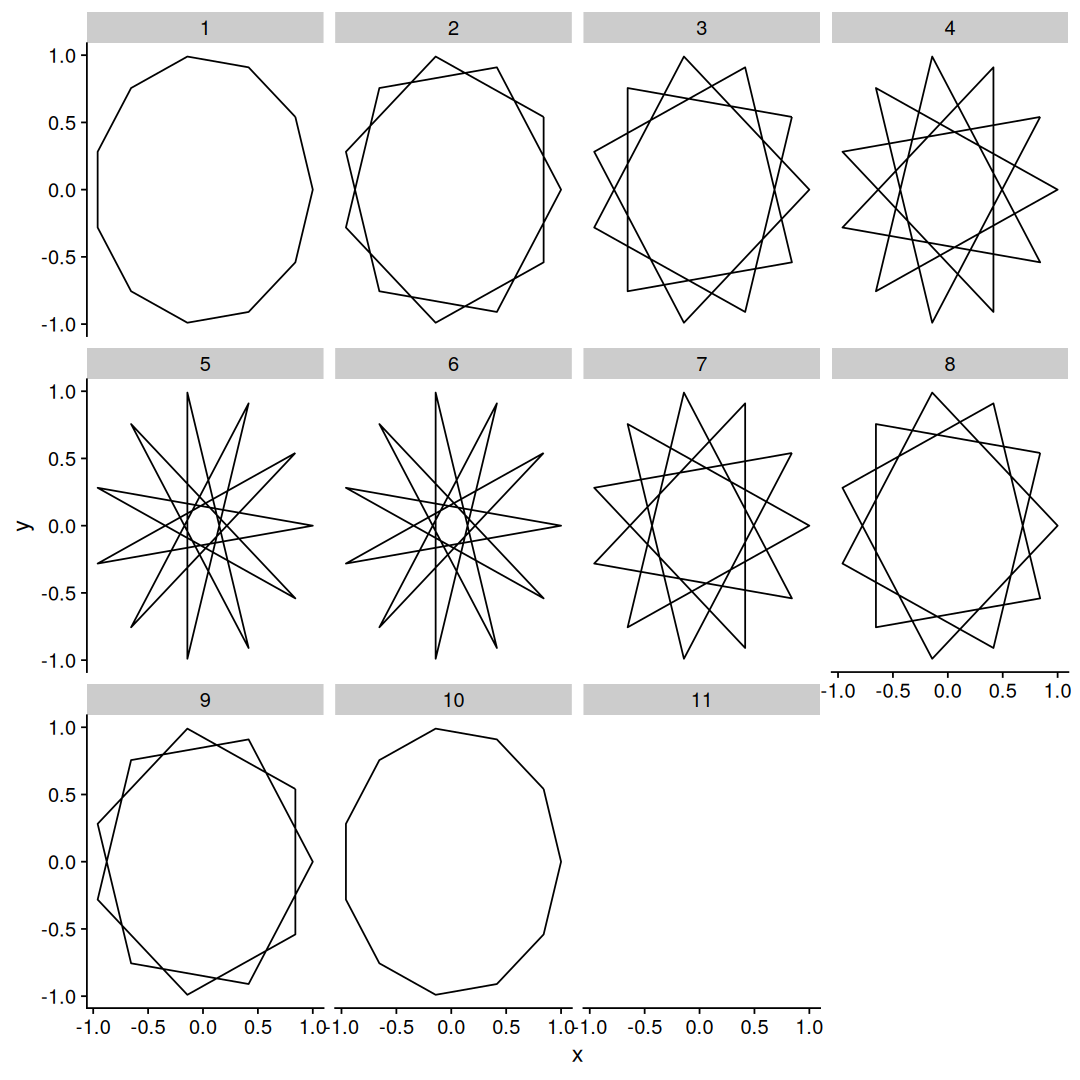 However, there is more than one way to draw an 11-point star polygon, there are 4 different ways in fact, and we can get these different ways by varying how many points we “skip”, so we need to modify our function to allow for this: