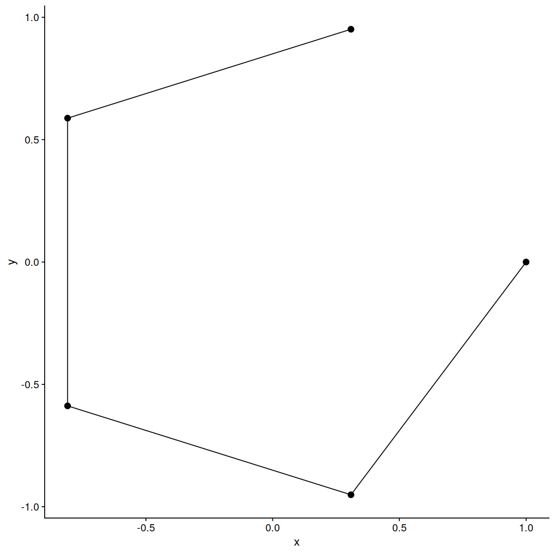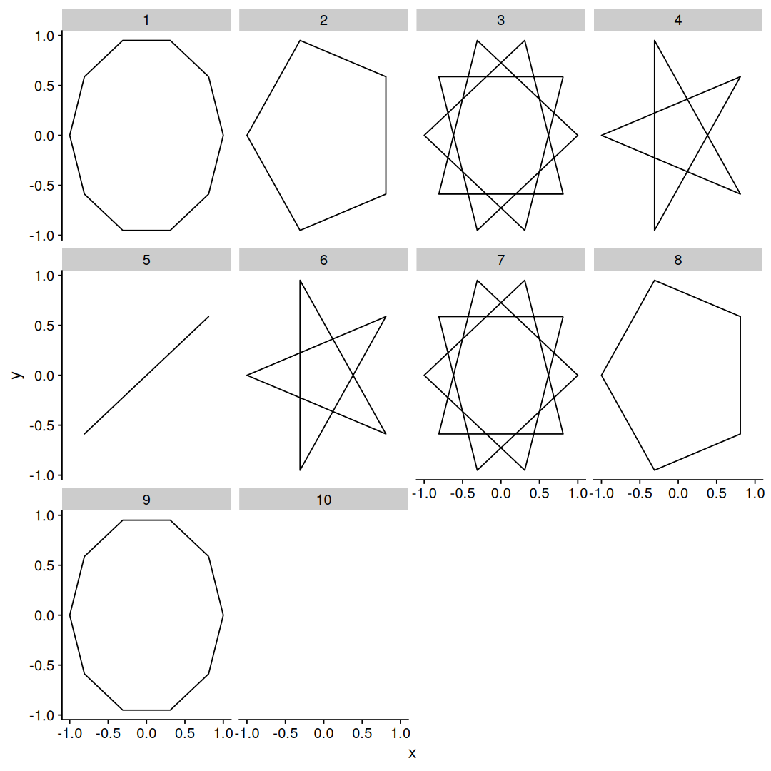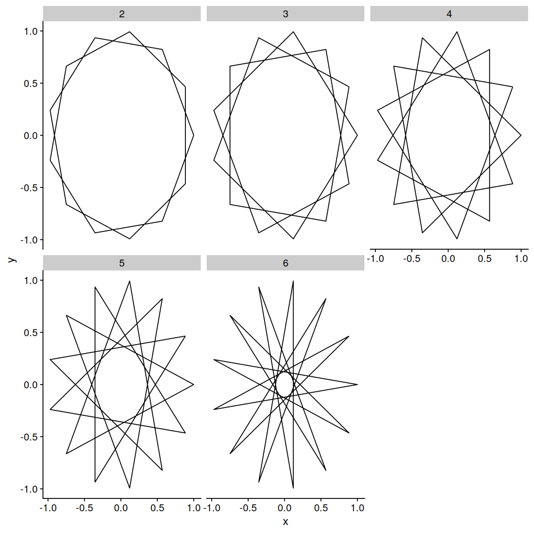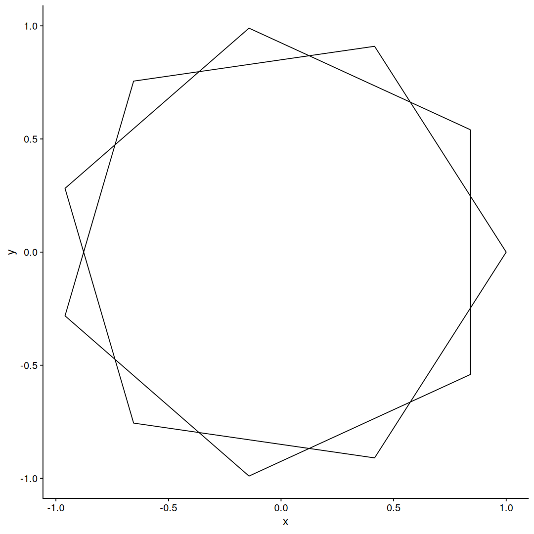 But we aren’t here to draw boring convex polygons, so let’s go back to geom_path, what we need now is to figure out how to re-order our points such that when they are connected they form a star polygon.