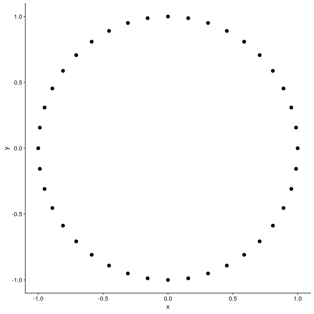 Here we defined a function that returns a data frame, each row of the data frame contains a point on the circumference of a circle,
