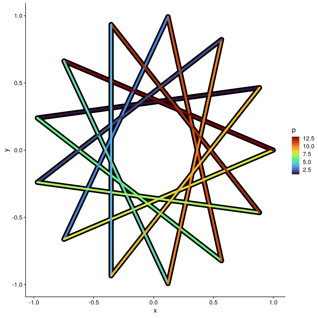 Note that we call geom_path two times, to create the border effect we are actually drawing the star twice, first thicker in black then thinner with different colors for each line.