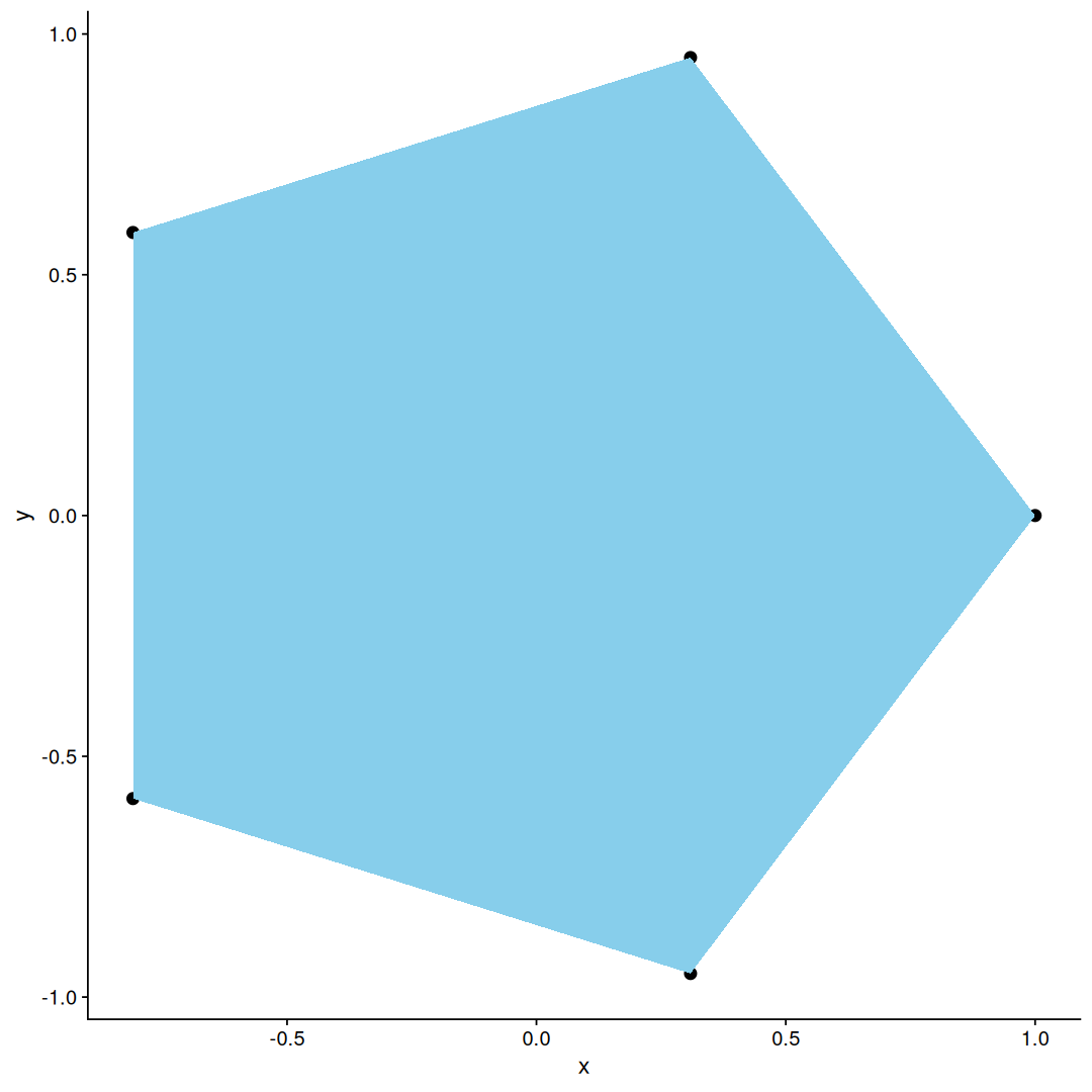 Now that is a proper pentagon! geom_polygon not only connects the ends for us, but it also allows us to fill the shape.