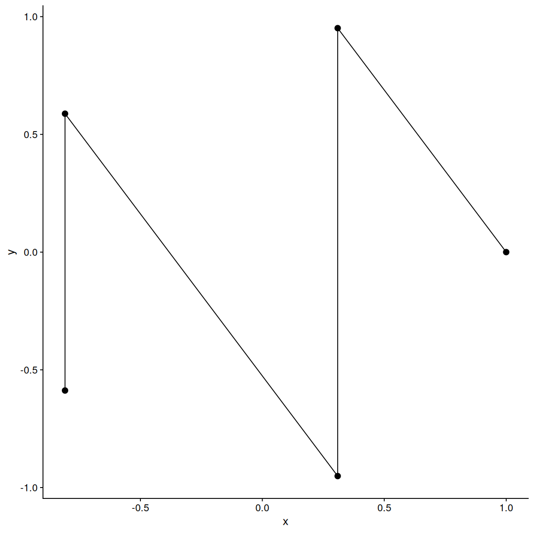geom_line connects the points in the order of the x-axis, this is usually what you want if you have a time series, but not in our case, we want the points to be connected in a specific order we will define, and for that, we can use the geom_path instead: