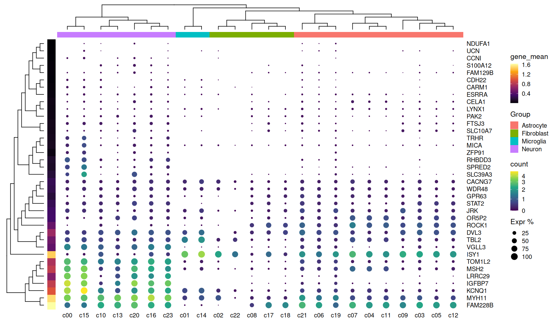 labs(size='Expr %', x='', y='')
