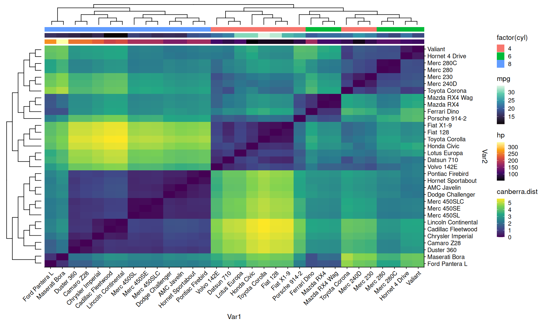 | Var1 | Var2 | canberra.dist | mpg | cyl | disp | hp | drat | wt | qsec | vs | am | gear | carb | |