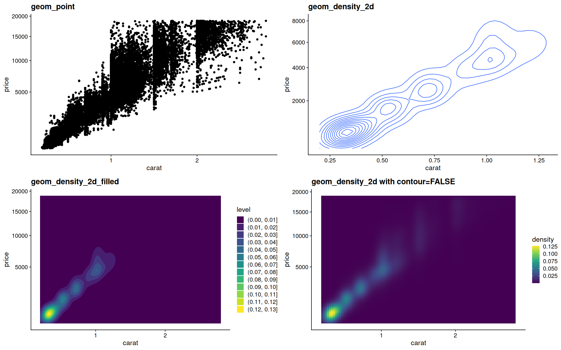 p4 <- p + stat_density_2d(geom='raster', aes(fill = after_stat(density)), contour=FALSE) + scale_fill_viridis_c() + ggtitle('geom_density_2d with contour=FALSE')