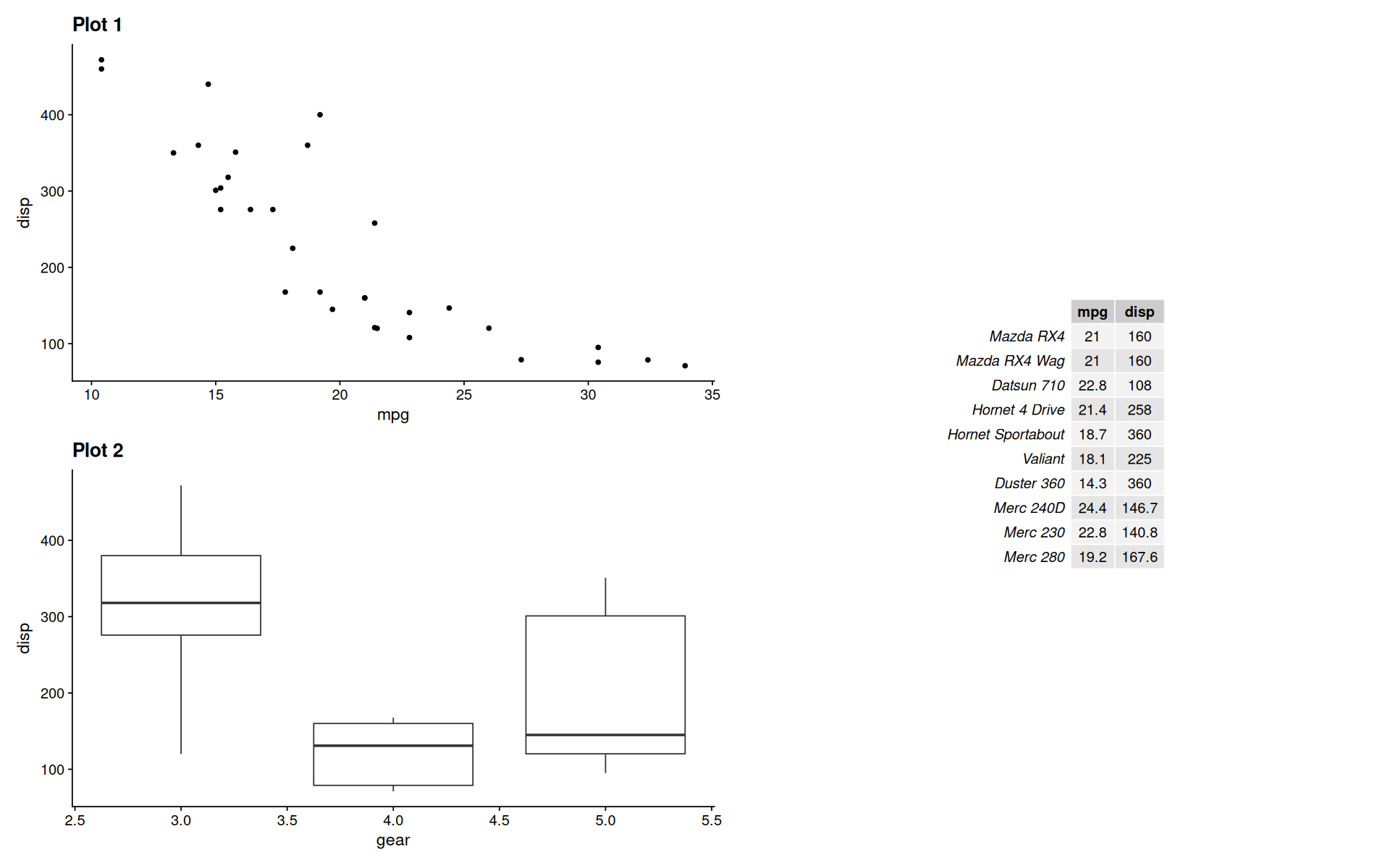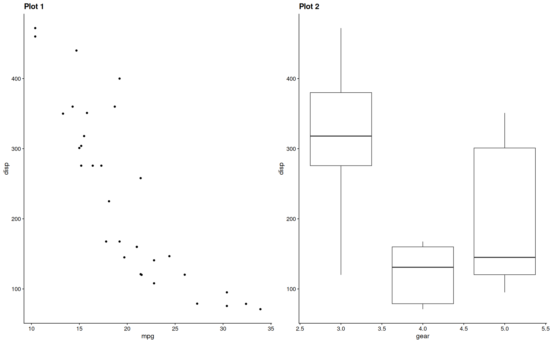 p2 <- ggplot(mtcars) + geom_boxplot(aes(gear, disp, group = gear)) + ggtitle('Plot 2')