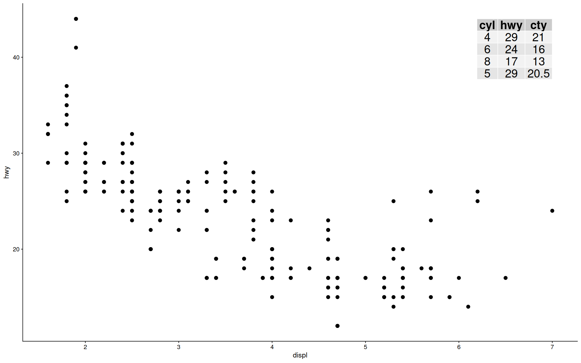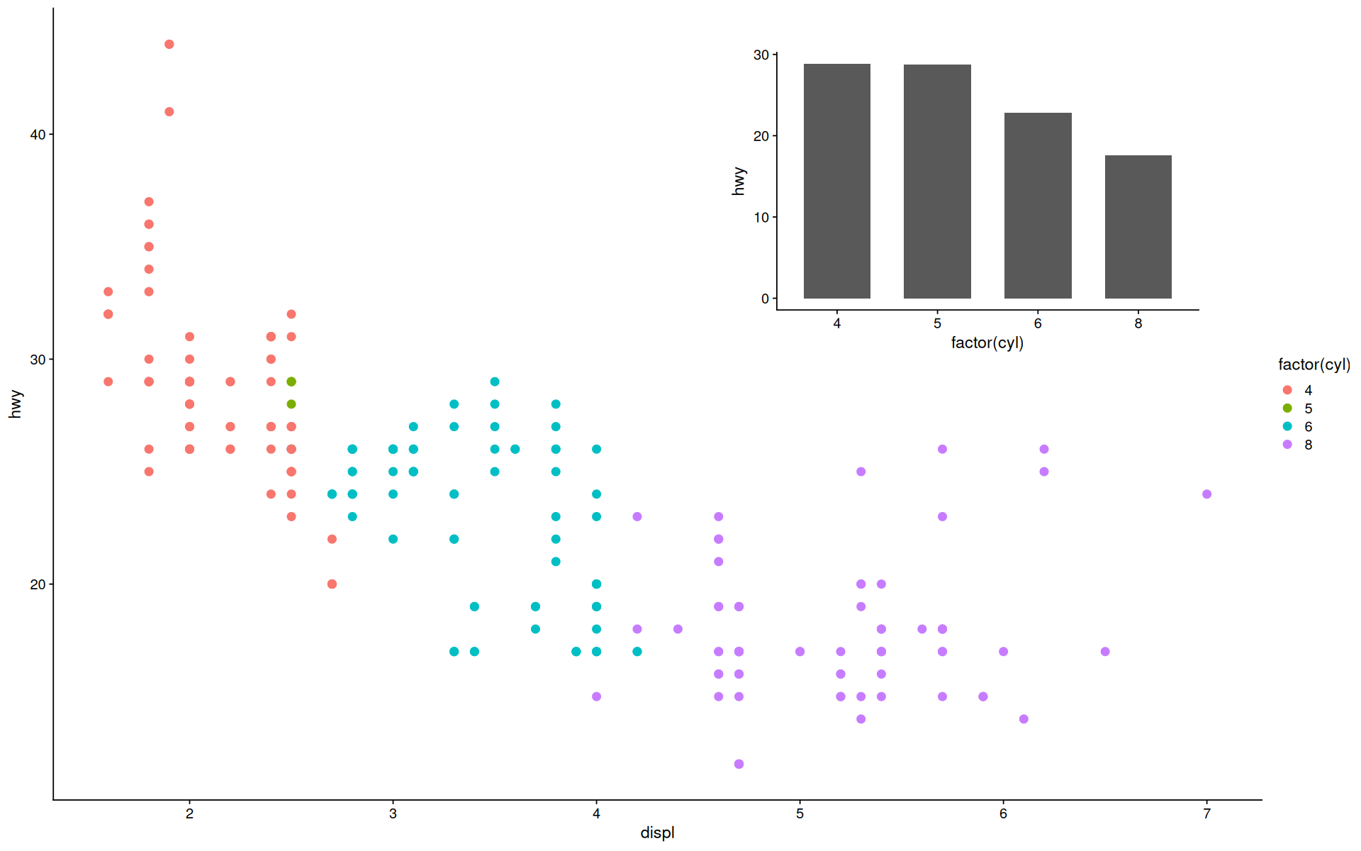 ggplot(mpg, aes(displ, hwy, colour = factor(cyl))) +