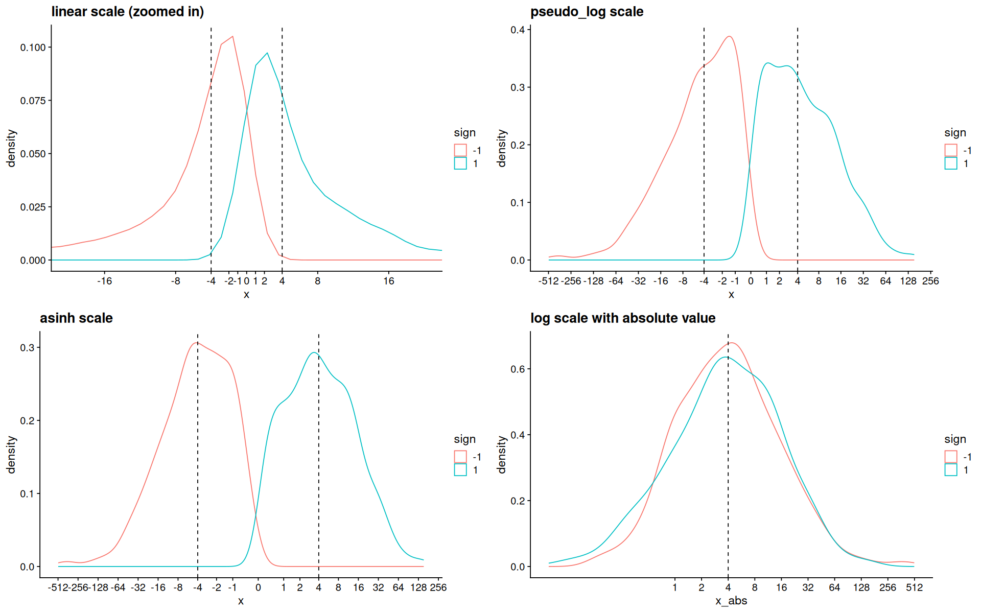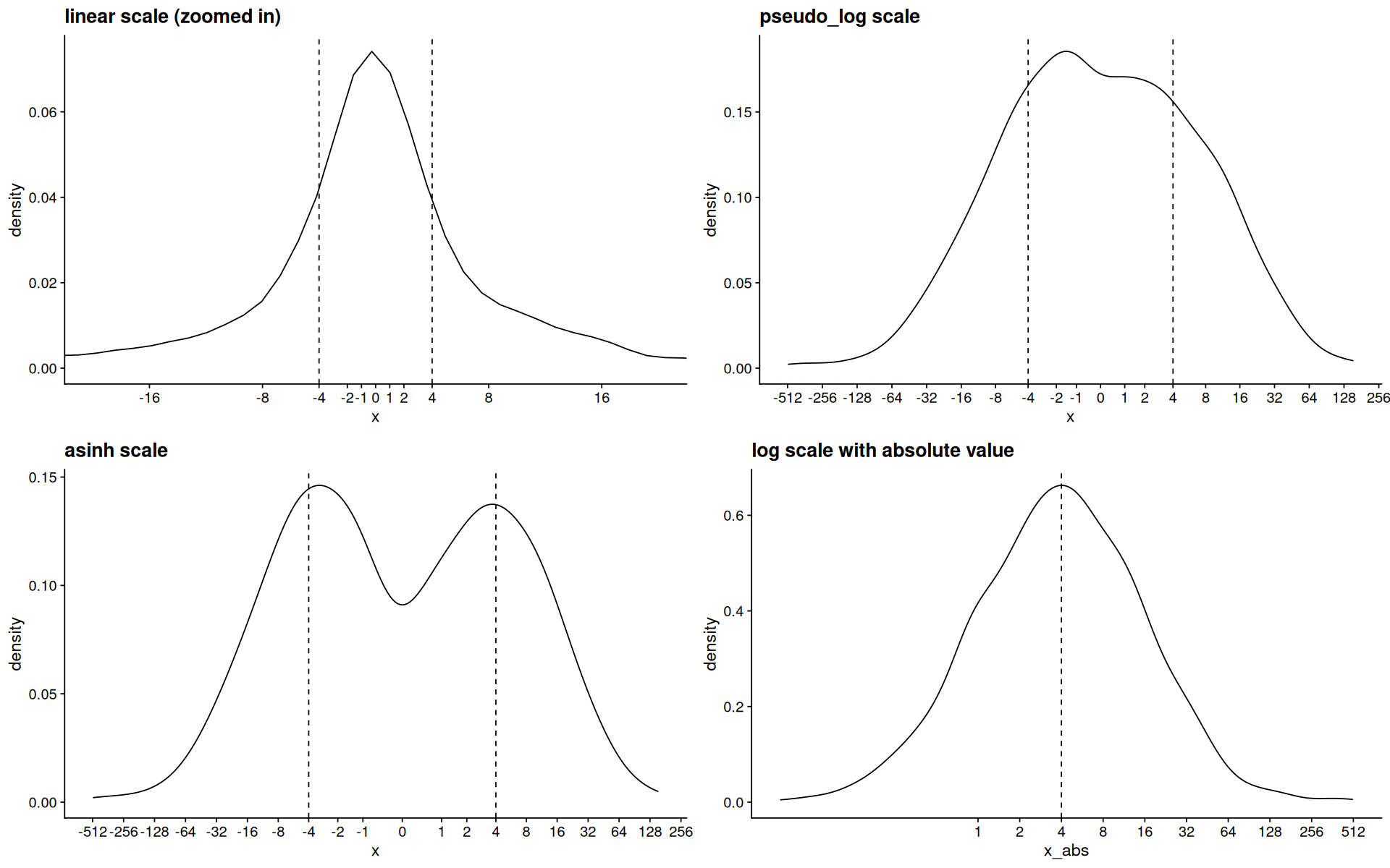 p3 <- p + scale_x_continuous(trans=asinh_trans(),breaks=my_breaks) + ggtitle('asinh scale')
