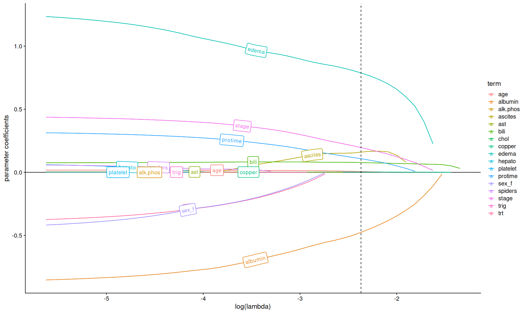 geom_vline(xintercept=log(cvfit$lambda.min), linetype=2) +