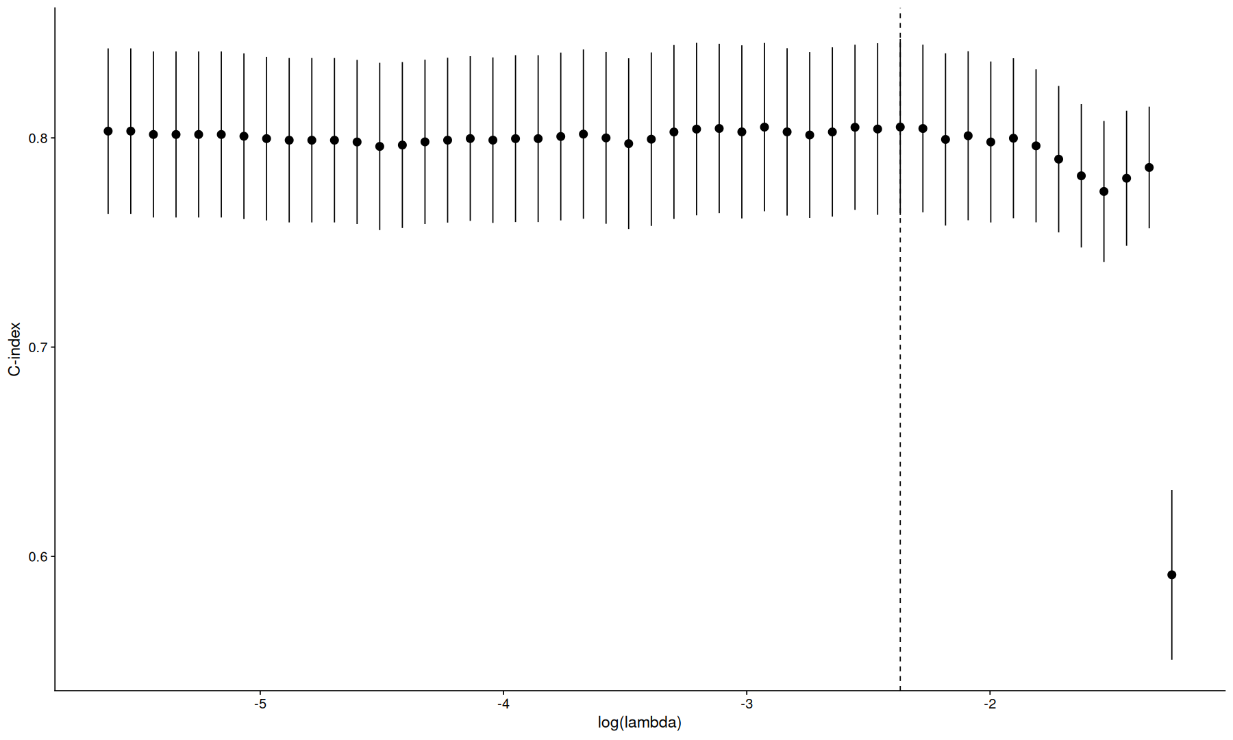 cvfit <- cv.glmnet(as.matrix(train_data_x), train_data$surv, family = "cox", type.measure = "C", nfolds = 10, alpha=1)