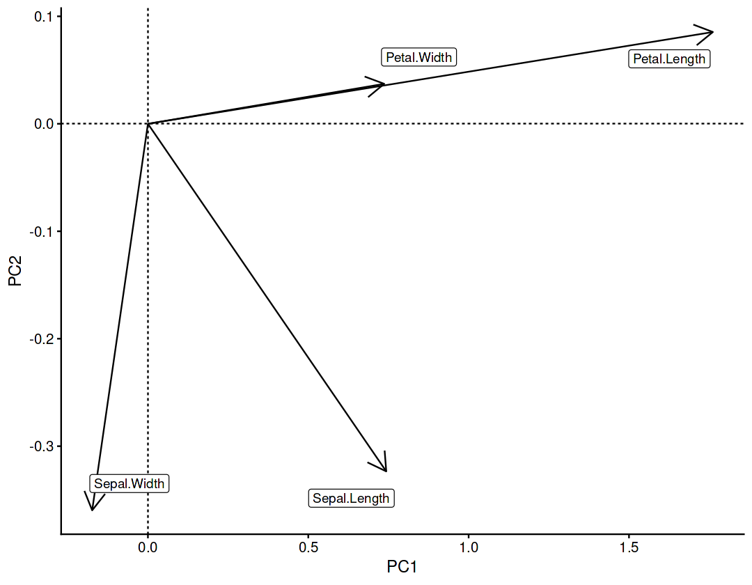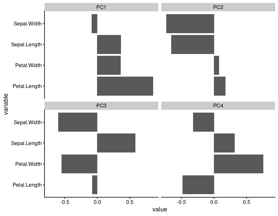 | Petal.Length | 0.85667061 | 0.17337266 | -0.07623608 | -0.4798390 |