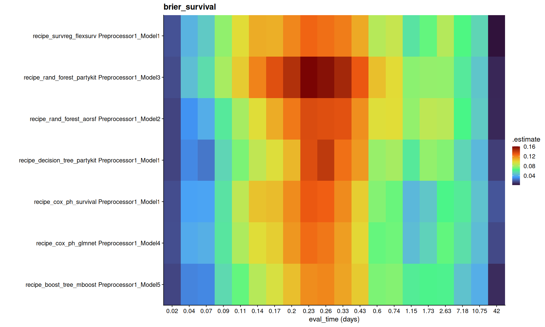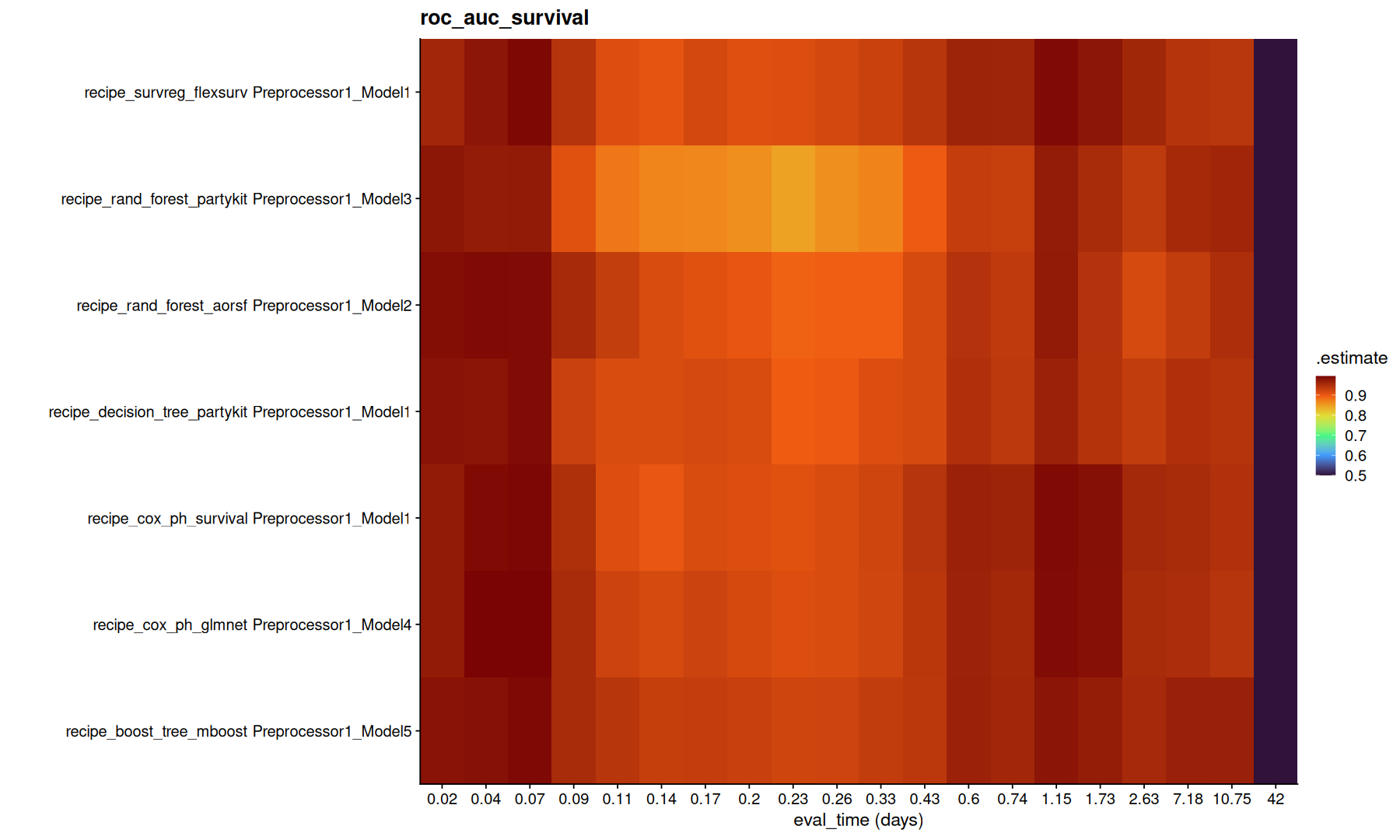 ggplot(df,aes(x=factor(round(.eval_time,2)), y=paste(wflow_id, .config), fill=.estimate)) +