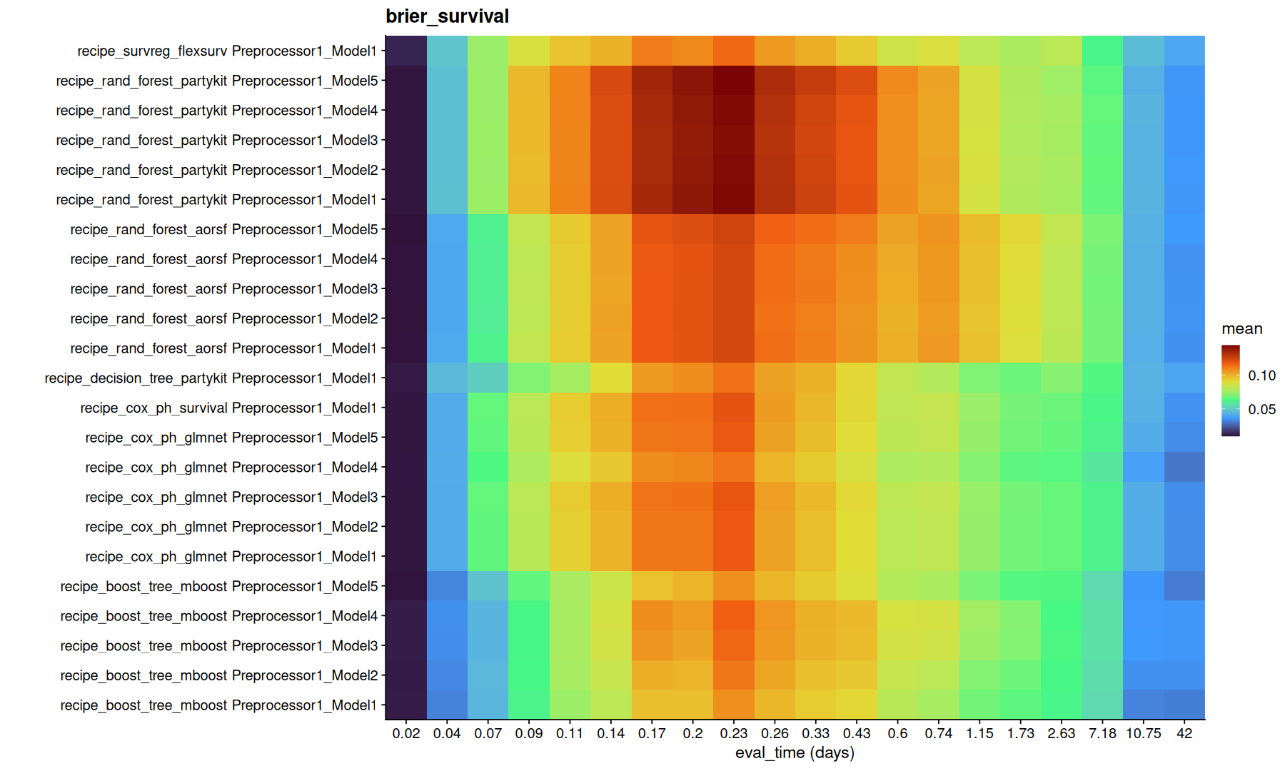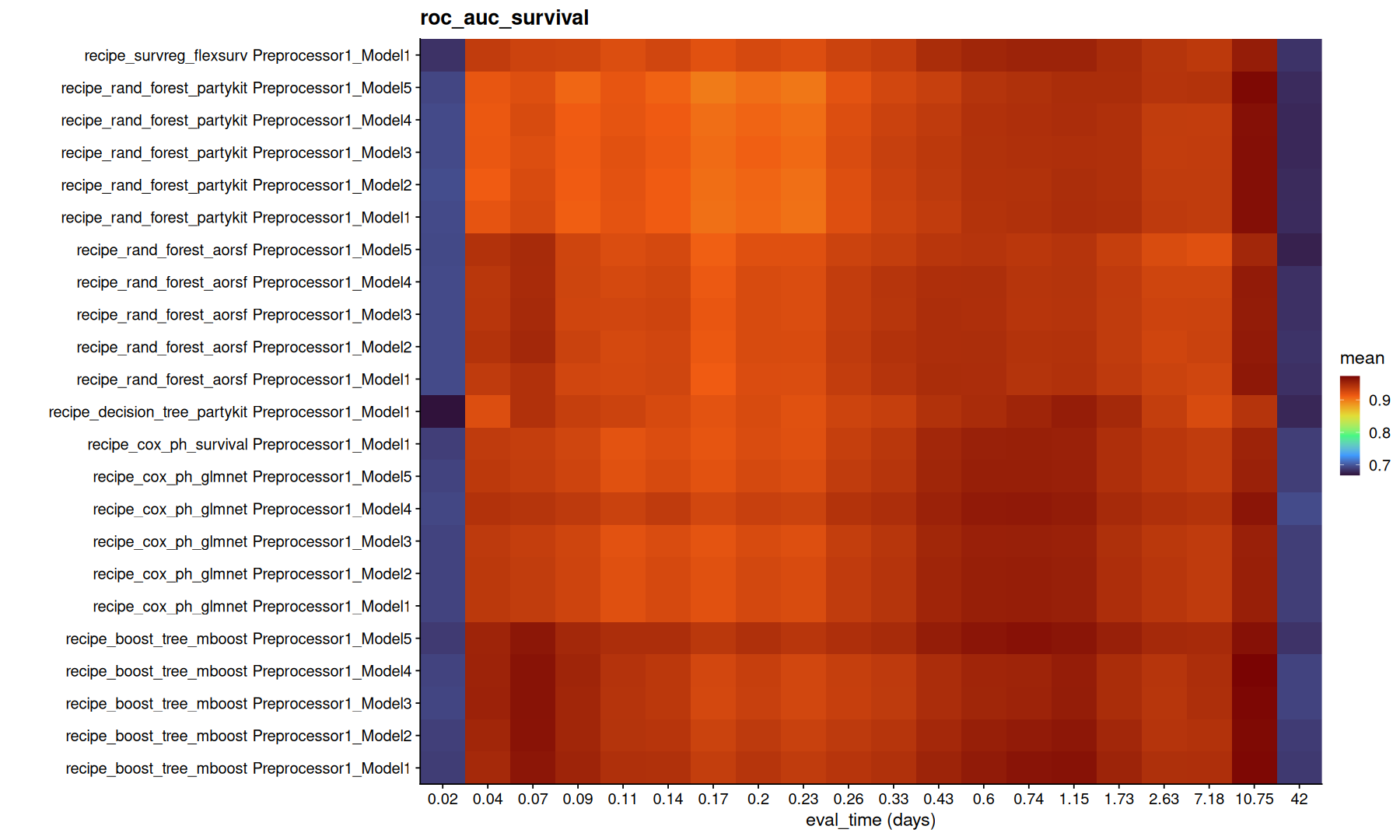 ggplot(df,aes(x=factor(round(.eval_time,2)), y=paste(wflow_id, .config), fill=mean)) +