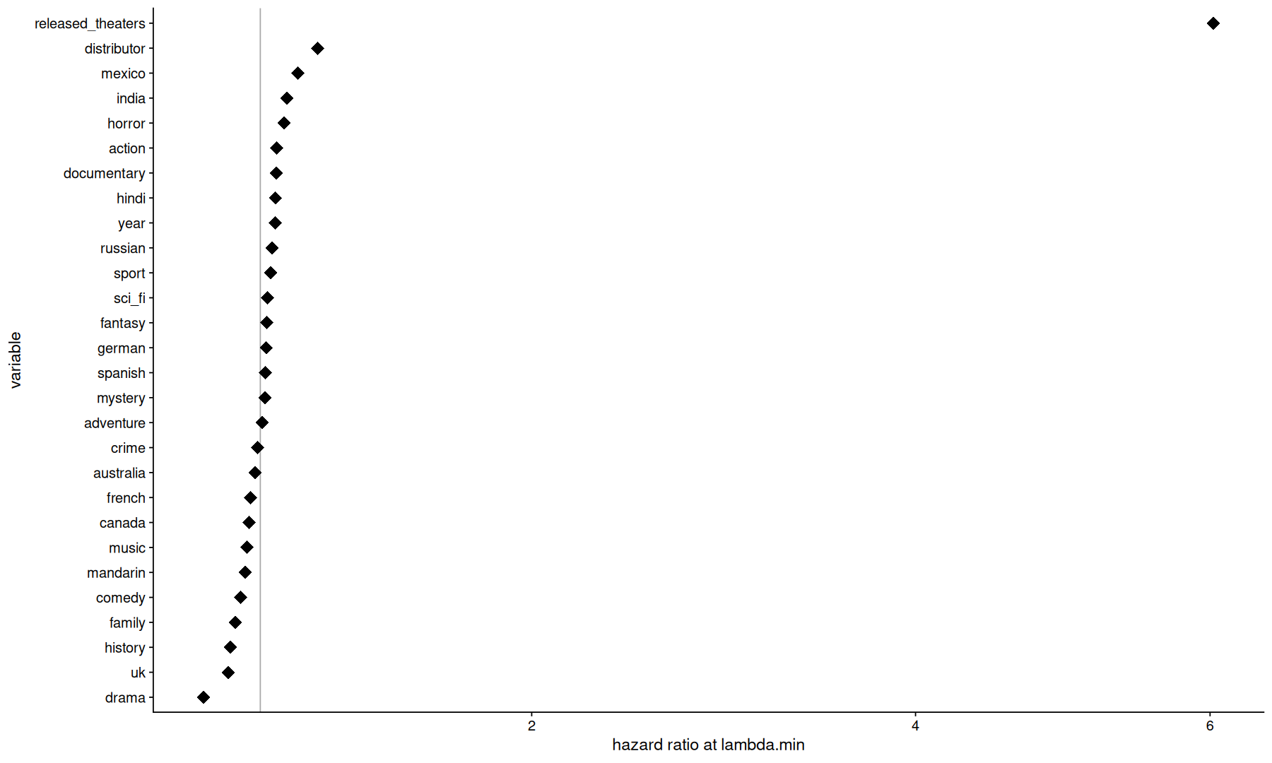 labs(x='hazard ratio at lambda.min', y='variable')